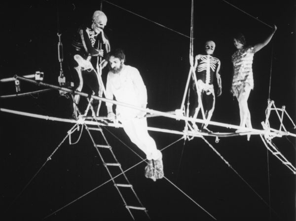 Zirkusfilme hatten während der Stummfilmzeit und nicht erst nach dem Erfolg von VARIETÉ (1925) Konjunktur. Der aus Dänemark stammende Regisseur Alfred Lind galt als Zirkusfilm-Experte, er hatte bereits 1911 den Urvater aller Artistenfilme und einen der frühen dänischen Welterfolge DIE VIER TEUFEL gedreht (Murnaus THE FOUR DEVILS von 1928 ist ein Remake davon). Hier mischt er dem Zirkusplot hier ein paar Horror- und Sci-Fi-Elemente bei, wobei er mit diesen leider so gar nichts anzufangen weiß. Die Tradition, dass die Artisten sich am Trapez möglichst furchterregend verkleiden müssen, hatte Lind bereits in DIE VIER TEUFEL geschaffen und knüpft hier daran an. Der radio-mechanische Mensch im Totenkopf-Kostüm ist aber kein Golem, nicht mal ein Golemchen, denn ohne die Fernsteuerung ist er harmlos und er wird leider auch nicht zu mehr genutzt als zu öden Hochseilnummern. Man erwartet, dass vielleicht der Blitz in die Fernbedienung einschlagen könnte und der Roboter Amok läuft, oder dass Magirus später seine Kreation für seine Rache nutzt – aber nichts dergleichen passiert. Die Schauwerte des Films liegen woanders. Da ist die ungeheure Leinwandpräsenz Goetzkes, dessen Dr. Magirus sich aber schnell ins Lächerliche verkehrt, da man seine Besessenheit von der ziemlich unscheinbaren Ziska nicht nachvollziehen kann. Das Drehbuch mag ihr eine besondere Ausstrahlung zugeschrieben haben, der Zuschauer merkt davon nichts. Außerdem scheint die Bedienung des radio-mechanischen Menschen dann doch super einfach zu sein, da Atto sie später in wenigen Augenblicken drauf hat, was Magirus Plan noch absurder erscheinen lässt. Die einzig gute Charakterisierung des Films zeigt Sigi Arno in einer für ihn ungewöhnlichen Rolle. Er ist zwar der Clown der Truppe, wobei leider auch seine Nummer nicht sonderlich gut ist, aber außerhalb der Manege ist er die Vaterfigur für die anderen und der einzig Vernünftige. Eine leicht amüsante Einlage gibt er nur, wenn er die Tiere füttert und mit ihnen interagiert. Die Tierszenen im Film sind ziemlich gut gelungen, wenn auch fast ausschließlich reißerisch angelegt. Die Tiere sind es, die die Bösewichter während eines Sturms besiegen: Dr. Magirus wird von einer Würgeschlange und einem Tiger angegriffen, während die böse Zirkusdirektorin von einem echten Bären (der zwar nicht sehr bedrohlich wirkt, aber ausnahmsweise mal kein Typ im Bärenkostüm ist) einen Fabrikschornstein hochgejagt wird.