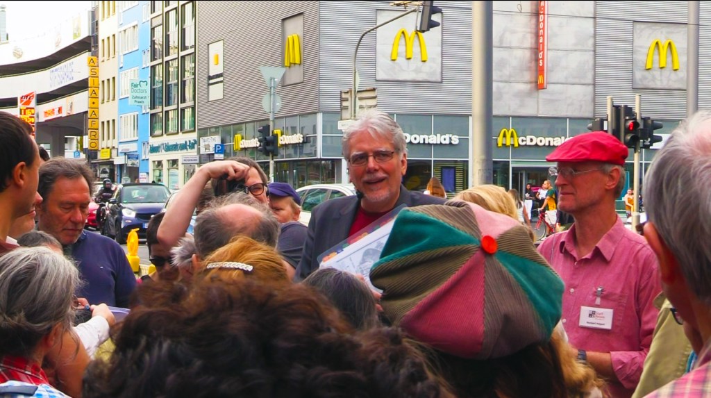 Am Mittwochnachmittag gab es eine von StattReisen Bonn veranstaltete Führung durch die Bonner Innenstadt, bei der Festivalleiter Stefan Drößler an viele ehemalige Kinos erinnerte. Er hatte viel Bildmaterial mitgebracht und garnierte seine Ausführungen mit persönlichen Erinnerungen und kritischen Anmerkungen zur Stadtpolitik. Eine ziemlich große Gruppe folgte ihm dabei und schwelgte gemeinsam in Kinoerinnerungen, oft begleitet von den irritierten Blicken von Passanten, für die nicht immer ersichtlich war, warum eine bestimmte Wand so viel Aufmerksamkeit auf sich zog.